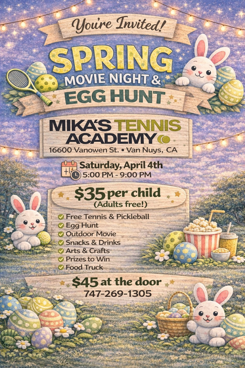 Join us at Mikas Tennis Academy for a fun-filled Spring Movie Night & Egg Hunt SATURDAY April 4th— a perfect family-friendly event to celebrate the season!