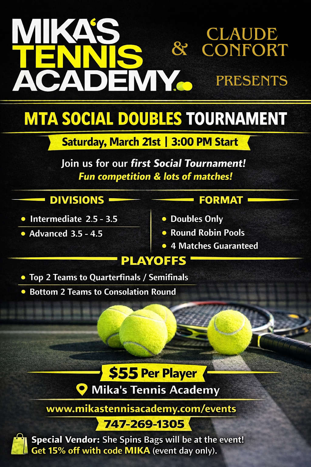 We’re excited to launch our first MTA Social Doubles Tournament, happening on Saturday, March 21st starting at 3:00 PM!