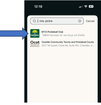 In the search bar, type MTA Pickleball Club.