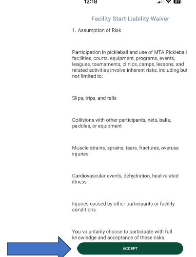 After selecting the club, you’ll see the Facility Liability Waiver.